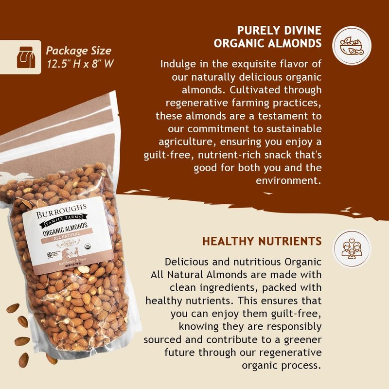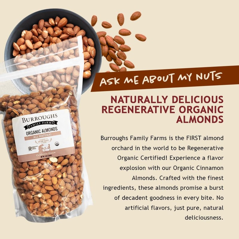 - NATURAL GOODNESS OF REGENERATIVE ORGANIC ALMONDS: Burroughs Family Farms is the FIRST almond orchard in the world to be Regenerative Organic Certified. Grown in harmony with nature, these almonds are a true embodiment of sustainability and taste. Crafted with the finest ingredients. No artificial flavors, just pure, natural deliciousness.