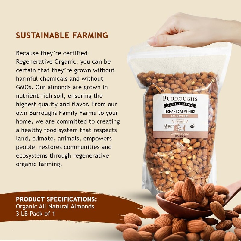 Burroughs Family Farms Regenerative Organic All Natural Almonds - Gluten-Free, Non-GMO Paleo Keto Almonds - Guilt-Free Delight Packed with Nutrient Rich Goodness - High in Protein and Nutrient Density, All Natural Satisfaction 3 LB (Pack of 1)