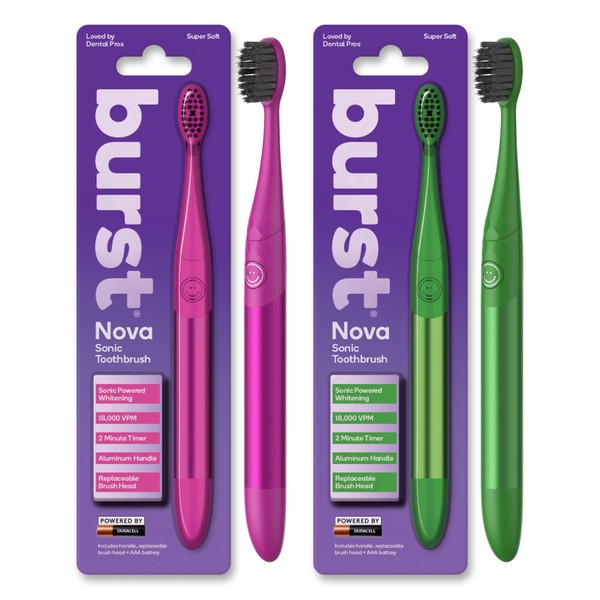 Burst Nova Toothbrush (2 Pack/Pink & Green) | Sonic Powered Teeth Whitening | Super-Soft Bristles | 18000 VPM | 2 Minute Timer | Aluminum Handle | Replaceable Brush Head | Compact Size | AAA Battery