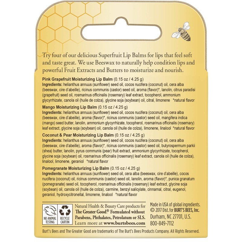Burt's Bees 100% Natural Moisturizing Lip Balm, Superfruit - Pink Grapefruit, Mango, Coconut & Pear, Pomegranate - 4 Tubes