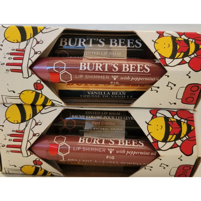 Burt's Bees Mistletoe Kiss Red Dahlia Vanilla Bean Lip Balm & Lip Shimmer 3pc Gift Set Tinted.