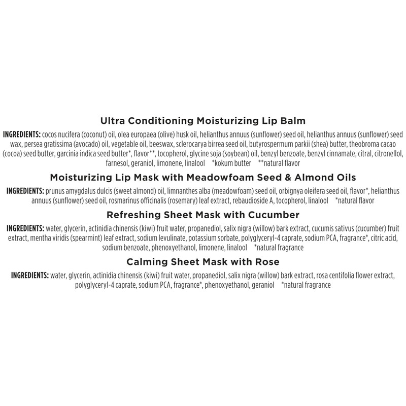 • HOLIDAY GIFT SET: Give the gift of self care with Burt’s Bees Mask Bundle Gift Set in festive, gift ready packaging; 1 lip mask, 1 ultra conditioning lip balm and 2 sheet masks