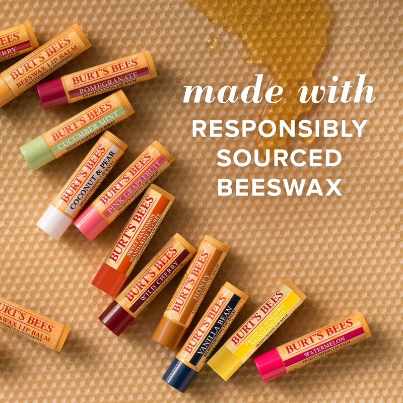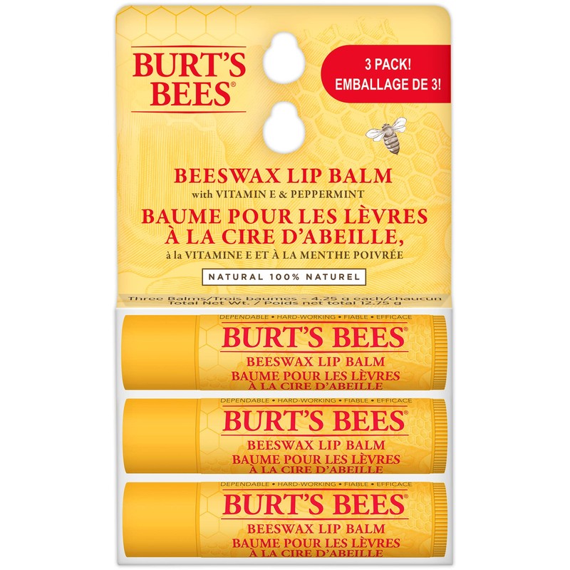 This Burt's Bees 3-Pack contains three Original Beeswax lip balms, a Burt's lip care classic. Each 100% natural lip balm is infused with natural beeswax and a dash of peppermint extract to richly moisturize and soften lips.