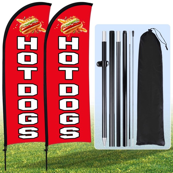 - Hot Dogs Feather Flag Kit: the package includes 2 hot dog banners, 10 poles, 2 stakes and 2 bags, which saves you the stress of sourcing different components separately and guarantees that you have everything you need for the ideal display