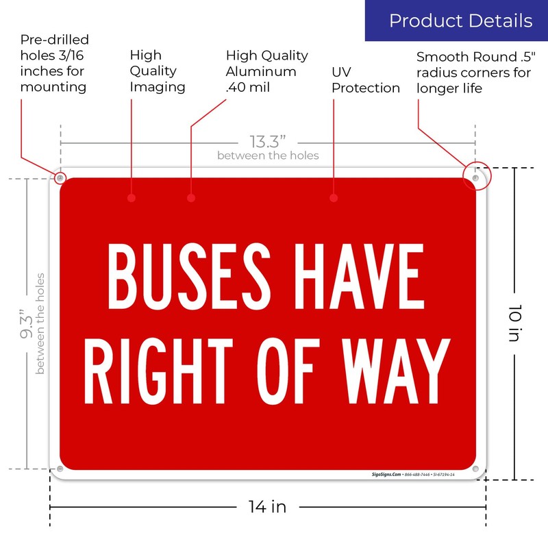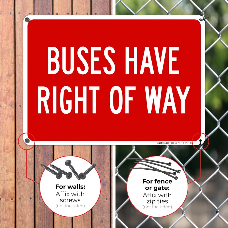 Buses Have Right of Way Sign, 10x14 Inches, Rust Free .040 Aluminum, Fade Resistant, Made in USA