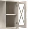 - Storage cabinet with tempered glass door and X pattern accent contains one adjustable shelf for items of various sizes