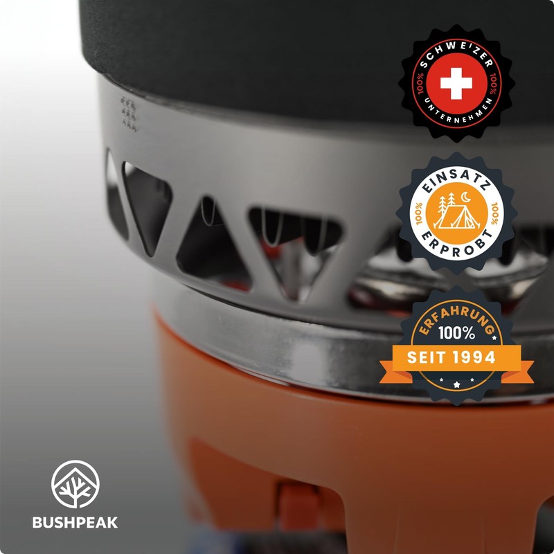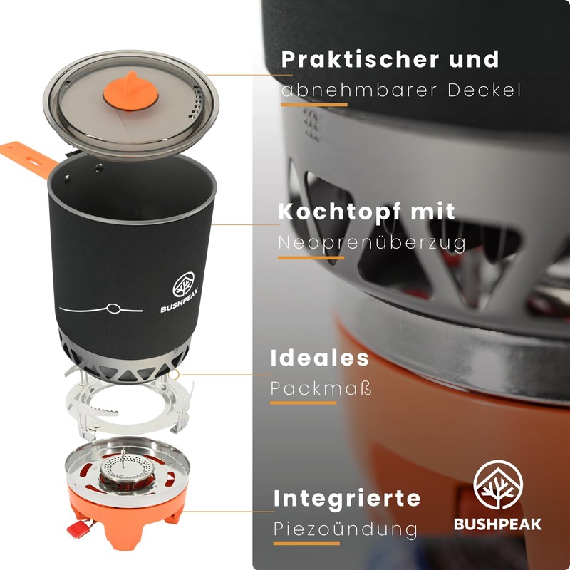 - Outdoor care – the instant boil gas cookers from Bushpeak are perfect companions for outdoor adventures. Whether delicious soups, warming teas or regenerating meals, with this gas cooker you can enjoy a hot meal anywhere.