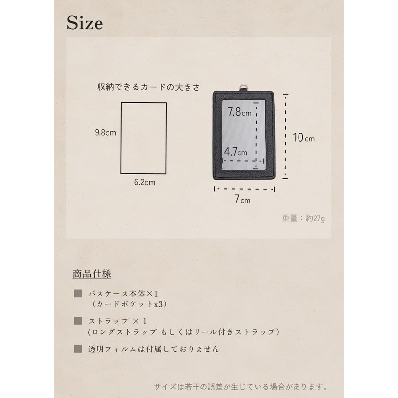 - Type: Slim pass case, Material: Genuine cowhide leather. Size: Main body: Height 3.9 x Width 2.8 x Thickness 0.1 inches (10 x 7 x 0.4 cm); Strap: 8.1 inches (20.5 cm) (including fittings)