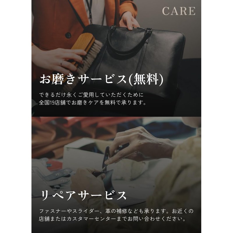 - (Free Polishing Service) Your precious leather items will be more beautiful and longer. 19 stores nationwide direct stores provide free polishing service for your purchase