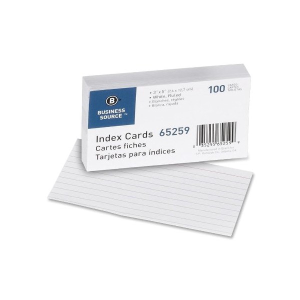 Business Source Products - Index Cards, Ruled, 90lb., 3"x5", 100/PK, White - Sold as 1 PK - Ruled index cards make note-taking easy and simple. Cards are rotary-cut for uniform height and ruled on one side only for versatile note-taking space. Each card