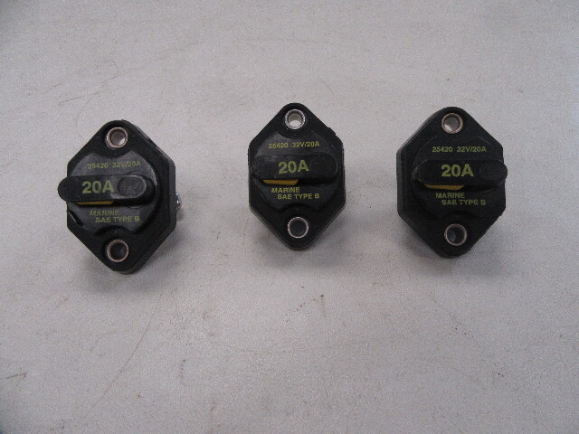 I am selling a (set of 3) of Bussman 20 amp / 32 volt circuit breakers, part # 25420. This item is new, not in original packaging and has a minor blemish on one of the sides from storage and comes as shown. This circuit breaker is black and yellow in color and roughly measures 2 1/8" length x 1 3/8" tall x 1 1/2" thick. The circuit breaker reads, "25420 32V/20A 20A MARINE SAE TYPE B." There are (2) mounting holes which roughly measure 3/16" ID and have a rough distance of 1 5/8" when measured from center to center. Rough measurements will be on photos. For more information regarding this item contact a dealer in your area. (RR / 57 C / 9109014) (10) Shipping cost is for the continental United States only (lower 48 States). For shipping outside this area, please inquire about shipping costs before purchasing.