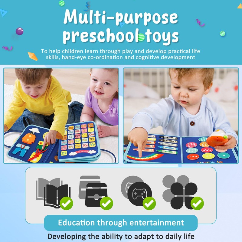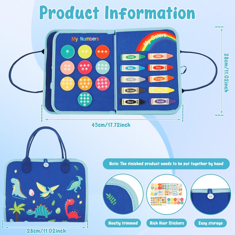 - 【Endless Fun】This busy book for toddlers helps in the development of life skills, fine motor skills, hand eye coordination, and problem solving abilities. With this felt board, your child will enjoy endless fun