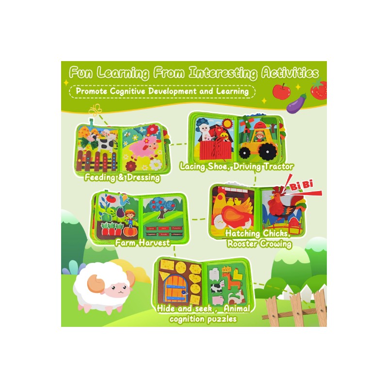 Montessori-Inspired Learning with 20 Engaging Activities: Our Farm Busy Board features 20 diverse activities across 10 pages, designed to enhance hand-eye coordination, muscle development, and self-care skills through Montessori principles. It fosters independent play, proactive exploration, and confidence-building in toddlers aged 3+, making it an essential early educational tool for home learning.