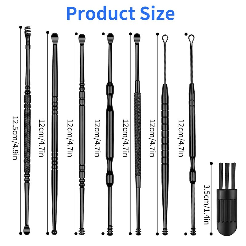 BUTBU Ear Wax Removal Kit, 8PCS Stainless Steel Ear Wax Remover1. Multifunctional combination design, suitable for different types of earwax;2. High-quality stainless steel material, durable, rust-proof and easy to maintain;3. Ergonomic design, comfortable and safe operation;4. Portable storage design to meet the needs of multiple scenarios;Product Specifications:Product material: stainless steelEar wax remover length:11.9~12.5cmStorage box size: 17.7*6*1.8cmEar wax remover color: BlackPackage includes:7*Ear wax remover1*Cleaning brush1*Storage boxNotes:1. Although the spiral/spring ear spoon can be rotated, it needs to be operated slowly and gently, and stop immediately when encountering resistance to prevent damage caused by bending of the ear canal or blockage of earwax.2. Although stainless steel is resistant to cleaning, avoid soaking in boiling water for a long time or heating in a microwave oven, which may cause the handle to deform.3. Make sure all tools are dry before storage, put them in a dustproof storage box, and avoid mixing with cosmetics, keys and other sundries to prevent contamination or scratches.If you have any questions, please feel free to leave a message and we will provide you with a satisfactory solution.