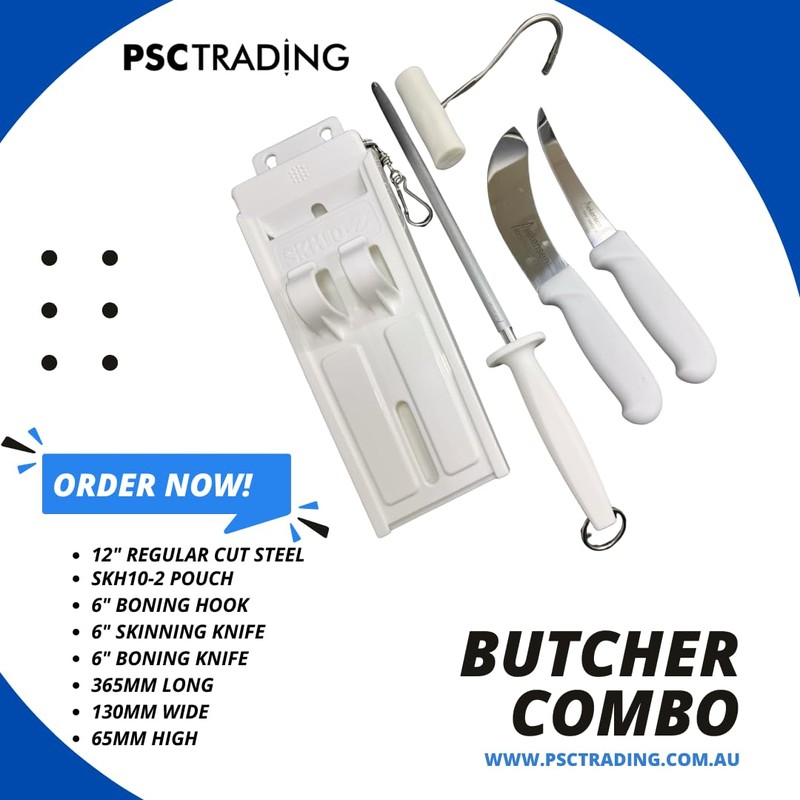 Butchers Pack - 5 Piece Butcher Set Includes 5" Boning Knife, 5" Skinning Knife, 12" Regular Cut Steel, Boning Hook and Scabbard