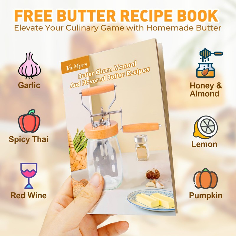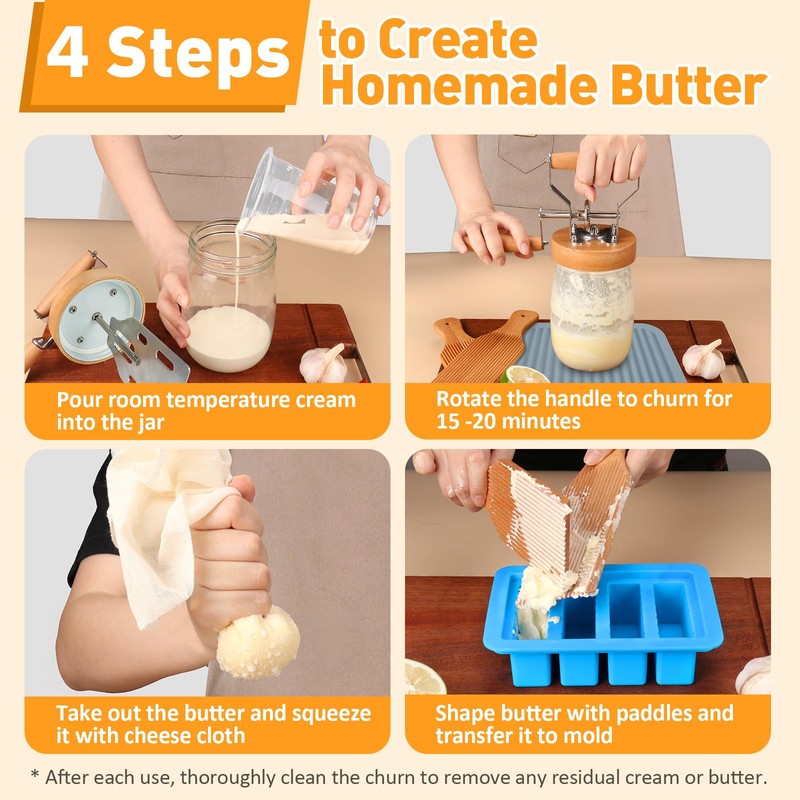 • ✅ 【WHAT YOU GET】The Butter Churn kit comes with everything you need to start making homemade butter. 1x 34oz Butter Churner Hand Crank Mason Jar, 2 x Butter Paddles, 1 x Silicone Butter Mold with Lip, 1 x Cheese Cloth, 1 x User Manual with 14 FREE Flavored Butter Recipes, 1 x Anti-slip Mat. It's a complete set, perfect for both beginners and seasoned butter makers. Plus, it adds a charming, vintage touch to your kitchen, making it not just a practical tool, but also a nostalgic experience.