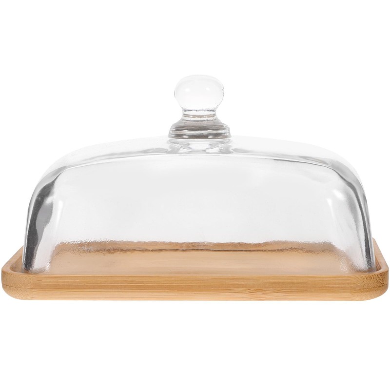 Butter Dish with Glass Lid- 18X12X10CM Clear Butter Tray for Refrigerator& Counter for Butter, Block of Cream Cheese& Serving Dish (Wood Tray)