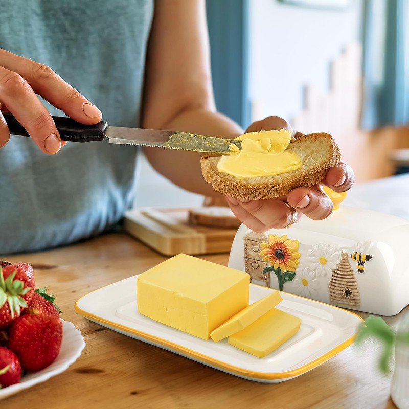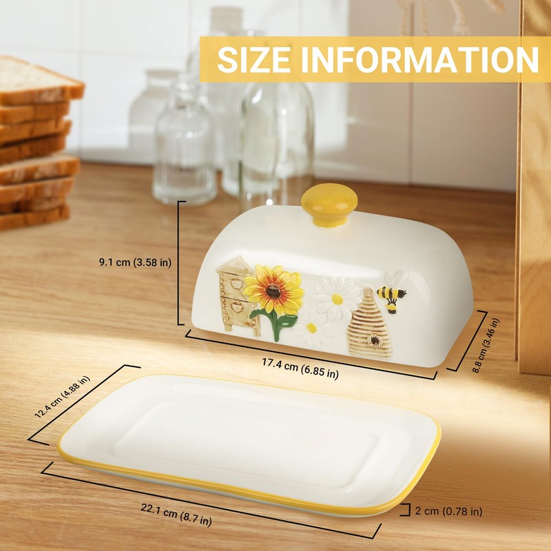- 🌻Hand drawn: This cute butter dish features unique sunflower and bee patterns, original hand drawn production, bright colors, and a cute style. It can add color to your breakfast table, enhance the ritual of breakfast plating, and is also a great kitchen decoration utensil.