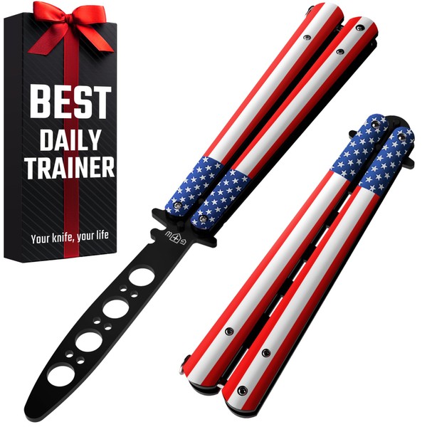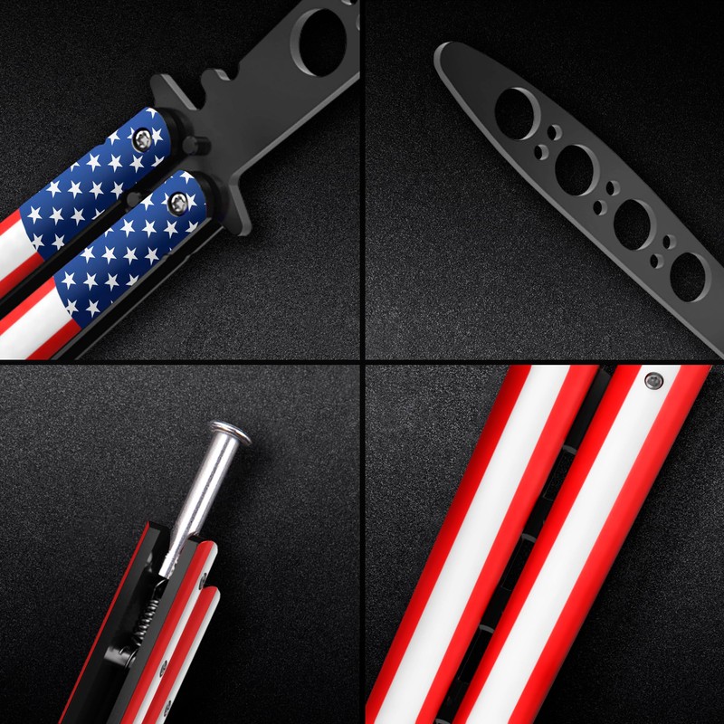 - Stylish and Patriotic: Our nice balisong knife with the American flag design is the perfect accessory for any proud American. Its sleek and compact design makes it an ideal everyday carry item. Show your patriotism with this eye-catching trainer knife that combines functionality with a touch of American pride.Country boy gifts. American flag gifts for men.