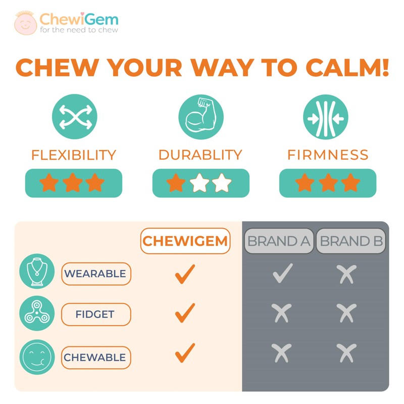 - LOVED BY MOMS LIKE YOU - With over 2 million products sold, moms like you count on Chewigem chew toys to support their children's sensory needs. Study shows that 91% of users report improved concentration and 93% report feeling calmer when using Chewigem Originals.