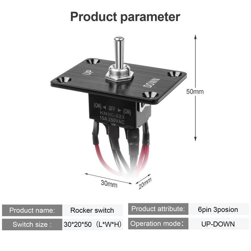 - Product parameters: Current and Voltage:15A-250V AC/DC Terminal:6-pin Waterproof baffle size:63.5mm *44.7mm *2.5mm (length*width*thickness) Package includes:1pcs toggle switch,1pcs waterproof cap ,1pcs waterproof baffle