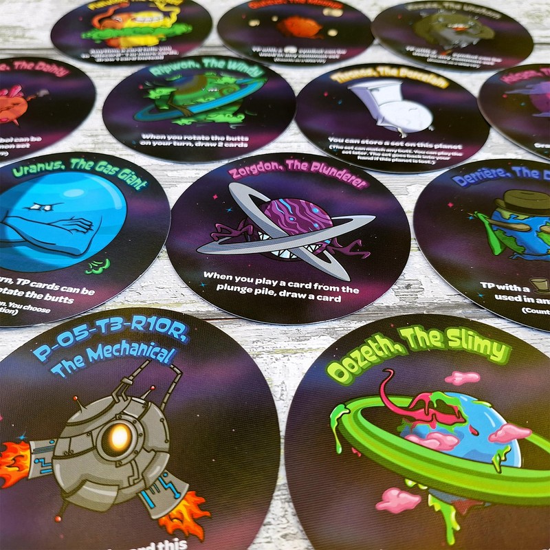Bundle of 2 products: Butts in Space Galactic Edition and Plungers & Planets 14"x24" Neoprene Game Mat. Evil Butt has stolen all of the toilet paper in the universe and destroyed your toilet spaceship! Play as Bow Butt, Hairy Butt, Classy Butt, and Butt Butt as you try to gather more toilet paper than your friends before your spaceship is repaired! Includes a large 14" x 24" centerpiece playmat that organizes the ship parts, nearby planet selection, plunge piles, and draw and discard piles.