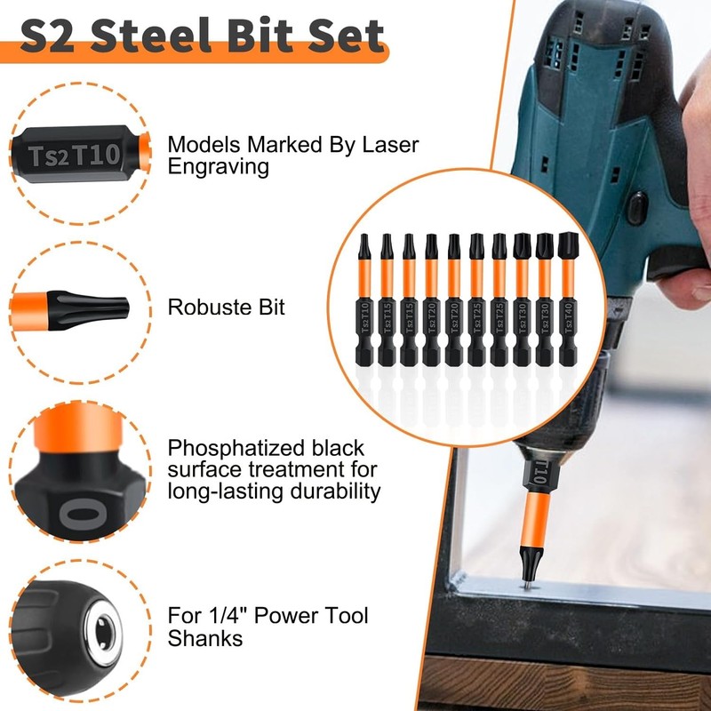 - High-Quality Material: The long bits are made of high-quality S2 steel, featuring a phosphated coating to prevent oxidation and corrosion. The bits are further enhanced by hardness treatment, providing increased torque and durability.