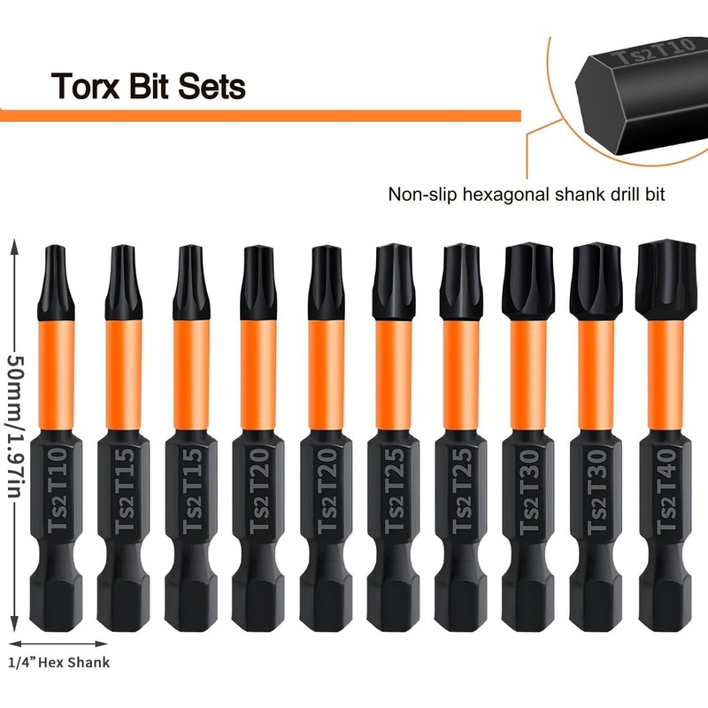- Specifications: This Torx bit set includes 10 pieces, each 50 mm long. The set consists of 1 x T10, 2 x T15, 2 x T20, 2 x T25, 2x T30, 1 x T40