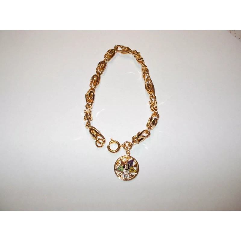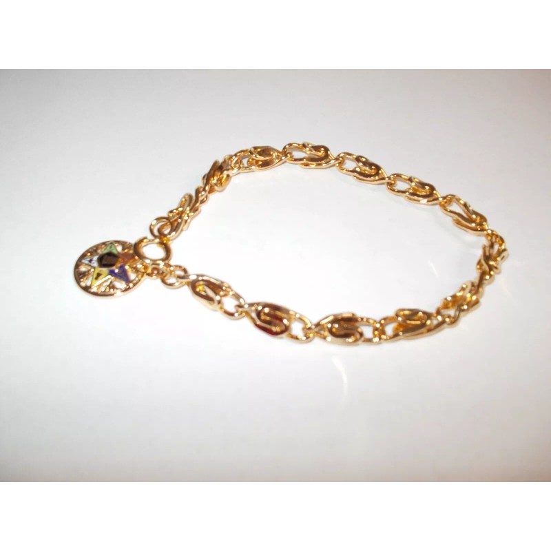 The wives of the Masons had some nice jewelry back when... and so they should. This 8in. chain bracelet is beautiful. RARE, and about perfect, this is either gold plated or electroplate. Not sure. But it is made well, and better gold was used in the old days. Symbol measures about 5/8in. This is vintage and yet, unused. Sitting in a box for 50+ years, and no tarnishing. Add this to your fraternal collection. Enjoy !