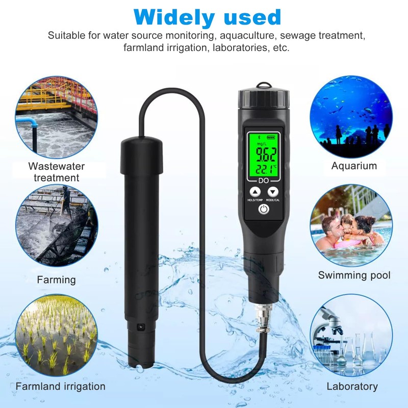 - Wide range of uses Suitable for a variety of environments, including aquariums, fish tanks, koi ponds, beer brewing, aquaculture, sewage treatment plants, educational purposes and various manufacturing applications. It can accurately measure dissolved oxygen content and temperatures in different environments