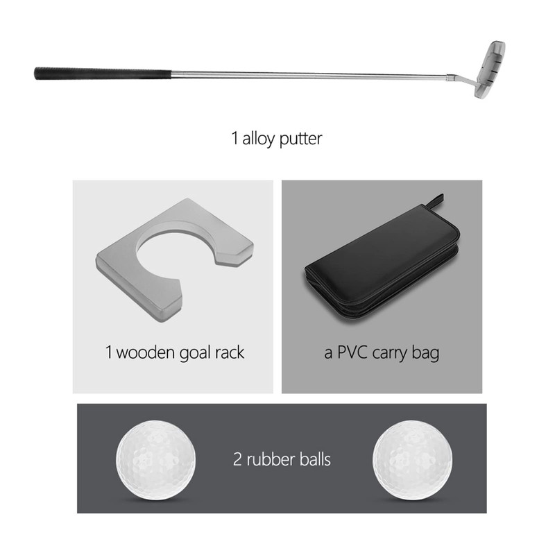 This golf putting cup includes 1 alloy putters, 1 wooden goal stand, 2 rubber balls and a PVC carry bag.