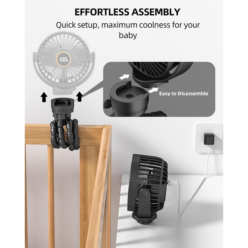- FLEXIBLE-TRIPOD-CLIP: The fan is equipped with a flexible tripod clip, which can be easily attached to the stroller handlebar, car seat, crib, bike seat, treadmill, or any other flat surface. It is convenient to use and provides a stable cooling effect.