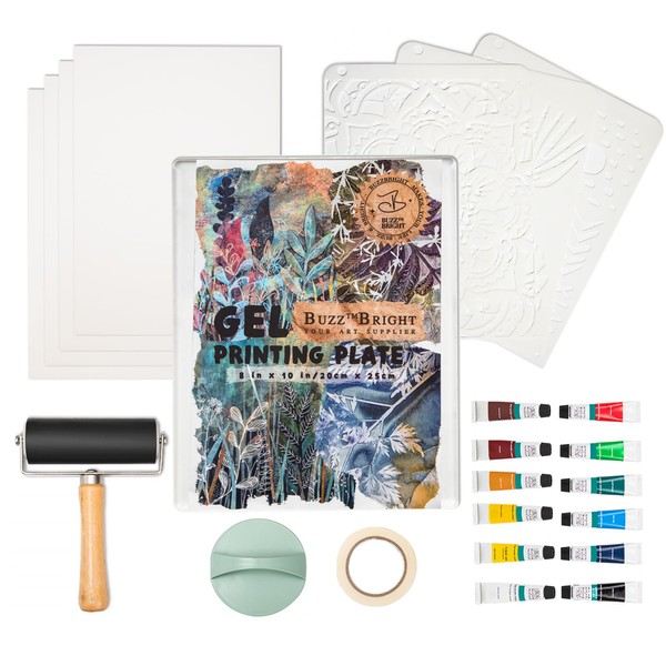 BuzzBright Gel Printing Plate kit, Complete Printmaking Set with 8”X10” Gelatin Plate, Brayer, Printmaking Paper, Acrylic Paint and Essential Tools for Mixed Media Art, Monoprinting, Card Making