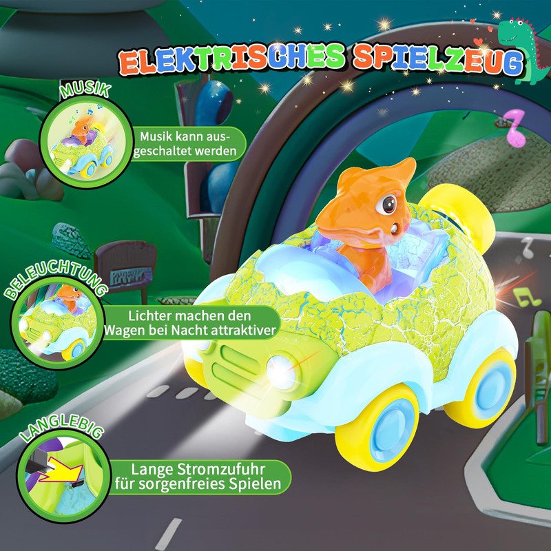 - Remote controlled dinosaur car with music and lights: This dinosaur RC car is equipped with cheerful music and bright lights that easily attract children's attention and promote children's concentration development. The bright colour scheme on the outside helps develop children's colour perception. When the remote controlled car starts, the cheerful music sounds and the lights go on, so that the children immerse themselves in a cheerful game journey.