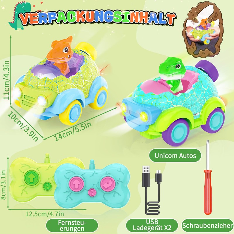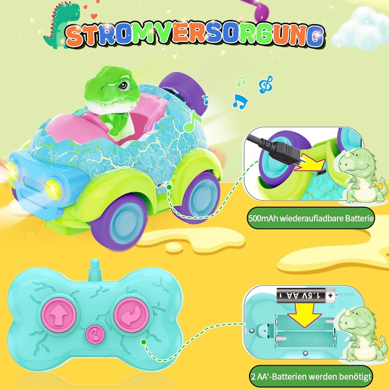 - Dinosaur theme design: this remote control car children in the look of the dinosaur theme design, the entire cartoon style, body imitation dinosaur eggs, dinosaur head removable. Cute and vibrant dinosaur theme design, help to increase the interest of children in old life dinosaurs, promote children's understanding of the dinosaur world to achieve the effect of edutainment.