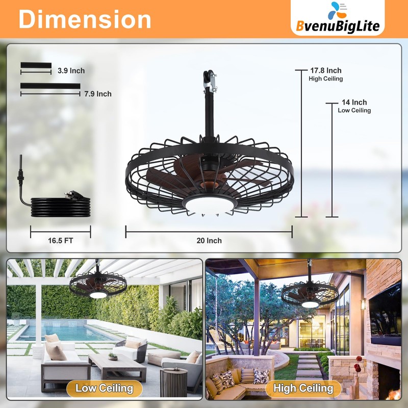 BvenuBigLite Outdoor Ceiling Fan with Lights: 20" Waterproof Plug-in Ceiling Fan with Remote Control Smart App - Gazebo Caged Hanging Fans for Patios Porch Pergola 6 Speeds Reversible - Walnut