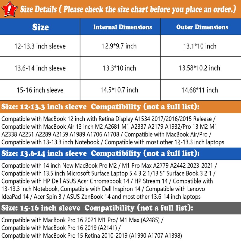 • Dimension: External dimensions: (L X W ) 34.5 x 26 cm / (L X W ) 13.58 x 10.2 inch. Internal dimensions: (L X W ) 34 x 25.5 cm / (L X W ) 13.3 x 10 inch. Please measure your laptop before purchasing. (The sum of the width (length) and thickness of your laptop should be less than the internal width (length) of the sleeve.)