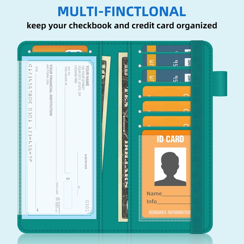 - COOL CONSTRUCTION: Our check book organizer with 1 ID crad slot, 7 credit card slots, 2 large pockets for checks, registers, bills, receipts and so on. 1 transaparent film part for you to put your ready-to-go checks and files for quick access. A pen holder design for the check book cover which can meet your daily use. With a elastic strap to keep the check book cover close securely without worring about the items to fall off.