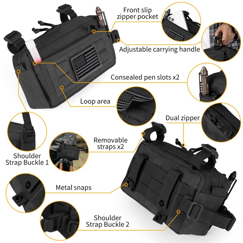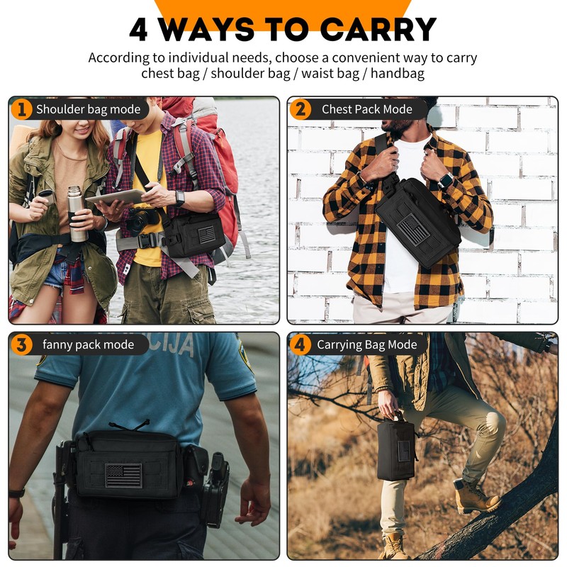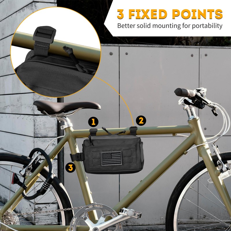 - Four Ways Carry: molle straps for attaching to any other molle compatible gears as a expansion pouch; adjustable shoulder strap for shoulder carrying or waist carrying; 2 adjustble short straps for attaching to bicycle crossbeam as a bicycle bag; side handle strap for handling as a handbag.