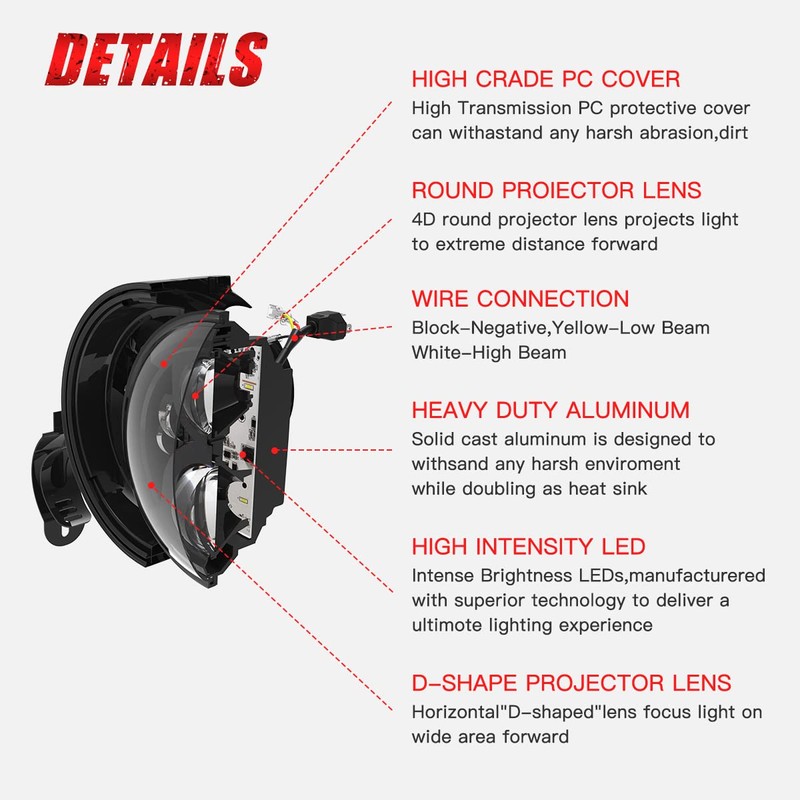- 【Quality Make】BWCarid 7 inch LED Motorcycle headlight Carried High-Quality High Bright XBD LEDs.Heavy-Duty Die-cast Aluminum Lamp Body With Ribbed-fin Design,for Optimal Efficient Cooling.IP68 Waterproof Sealed PC Lamp Cover.Convex Projector Lens.Built-in EMC & Anti-flicker Chips,Provide Brighter,Stable,Long-lasting,Without Light Decay Output,Work Properly Even in Harsh Condition.High Quality Stainless Steel 7" led headlight Housing Bucket,Rustproof,Shockproof,Durable,50,000hs Long Lifespan.