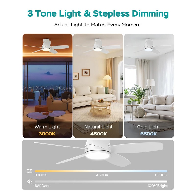 - Stepless Dimming & 3000K-6500K Color Temperature Adjustment:The flush mount ceiling fan with lights features stepless dimming, allowing for seamless adjustment of light intensity. With a color temperature range of 3000K-6500K, the low profile ceiling fan with light meets diverse lighting needs, suitable for various scenes.