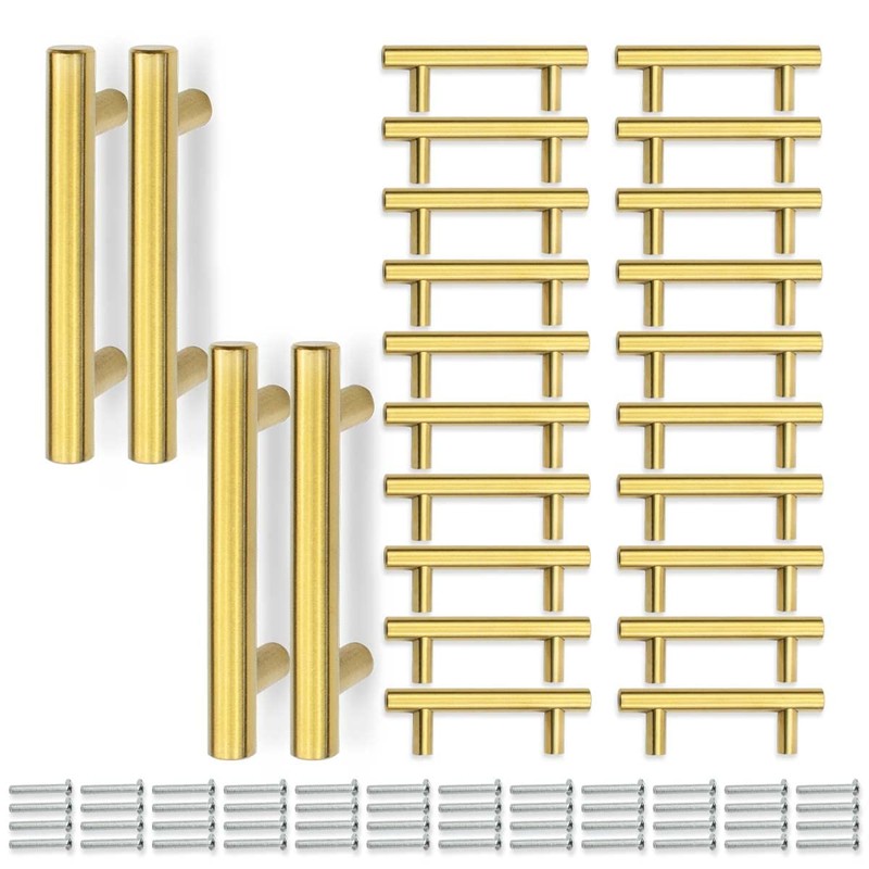 Bwintech 24 Pieces 100 mm (64 mm Hole Center) Gold Cabinet Pull Handles Kitchen T Bar Handles, Stainless Steel, Ideal for Cupboard, Drawer, Cupboard