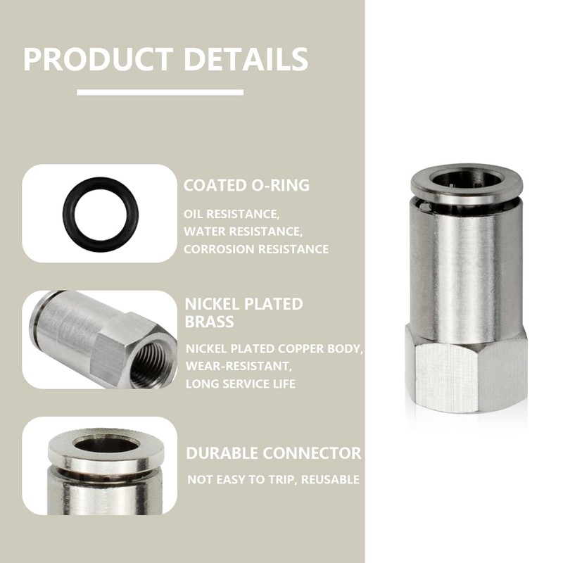 - 【Quality Goods】This fittings are made of high quality Nickel plated brass, durable and no air leakage for long term use. Built-in stainless steel locking claw and NBR O-ring, you'd never worry about that tube falls off. High pressure resistance, can withstand strong pressure without tripping, so no tripping needed.