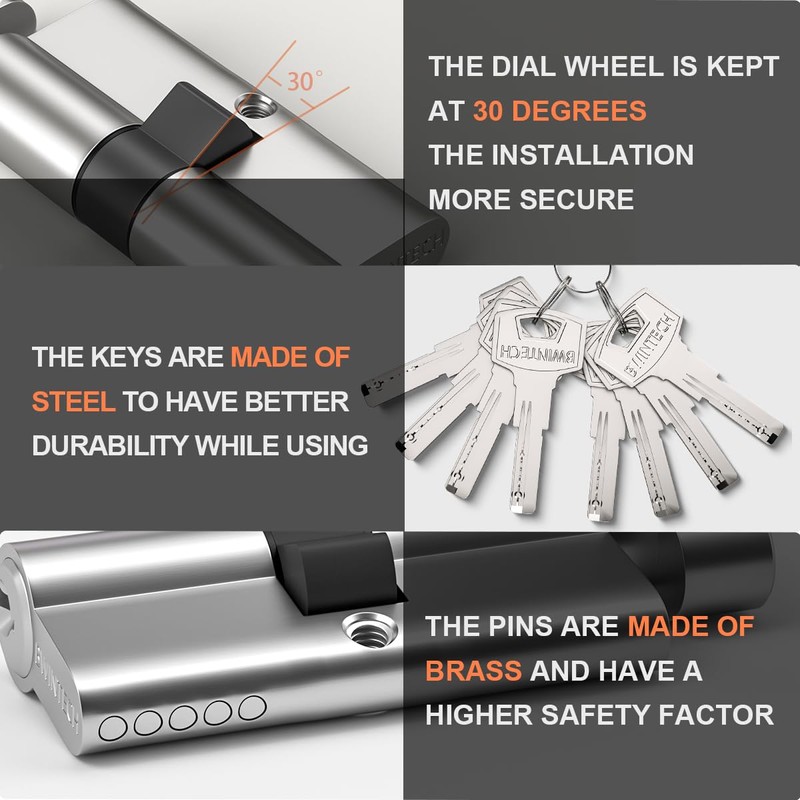 Bwintech 60 mm (30T/30) Nickel-Zinc Alloy Euro Cylinder Lock, Door Drum Lock, Key Key with 8 Horizontal Dimple Keys