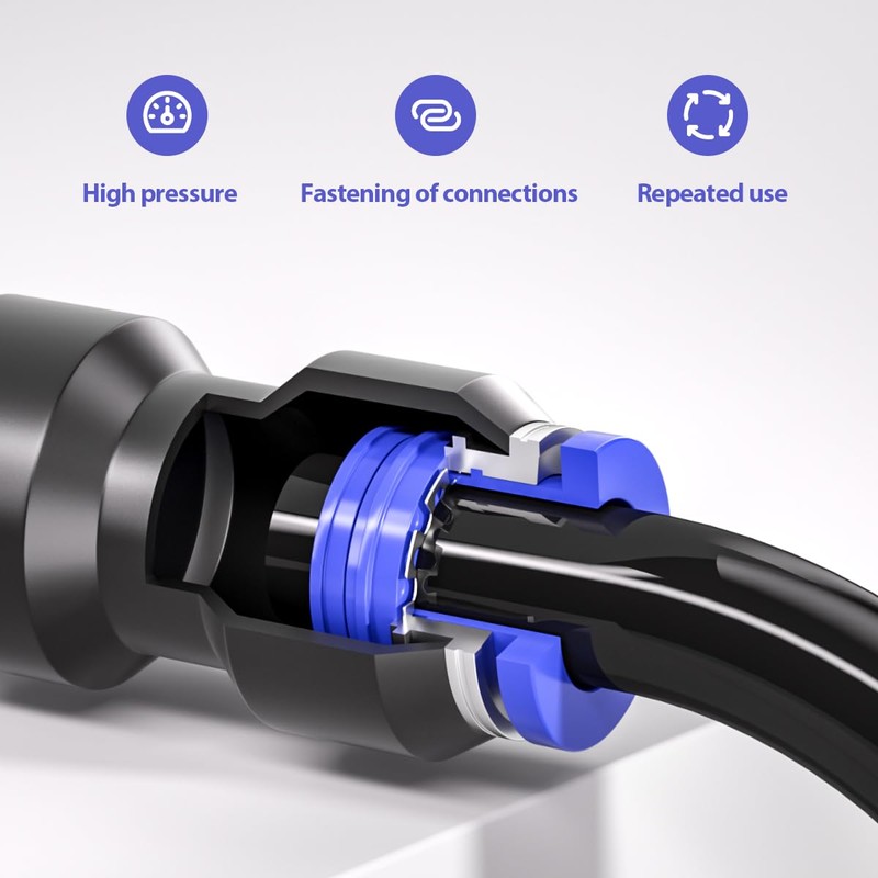- Quality goods: these fittings are made of high-quality plastic, durable and no air leakage for long-term use. Built in stainless steel locking claw and NBR O-ring, you would never worry about the hose falling off. High pressure resistance, can withstand strong pressure without triggering, so no triggering is required.