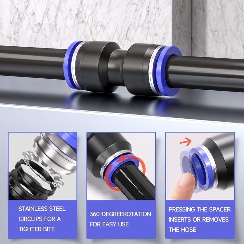 - Easy to intall: no additional seal is required, just a simple pressure to connect the pipe and they are firmly connected. Elliptical release rings at both ends are more convenient to disassemble without additional tools. In addition, these fittings are flexible and space-saving, 360 degree free rotation.