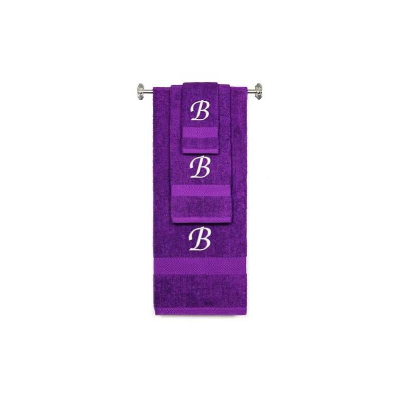 - Terry cotton ring spun bath towel, hand towel and washcloth set - Purple Towel Set, White Chancery Initial B