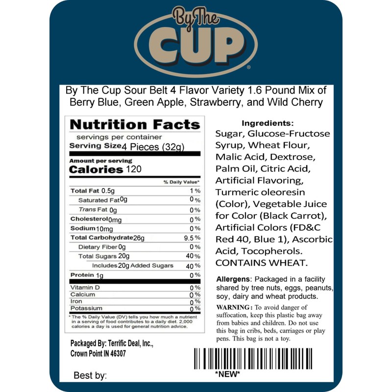 By The Cup Sour Belts have the taste that kids (and kids of all ages) love! Since 1985, Sour Belts have been offering a variety of mouth-watering flavor varieties that people can't seem to get enough of! They have just the right amount of sour.... enough to make you pucker but not scald your tongue. Includes 4 tart and fruity flavors: Berry Blue, Green Apple, Strawberry, and Wild Cherry.