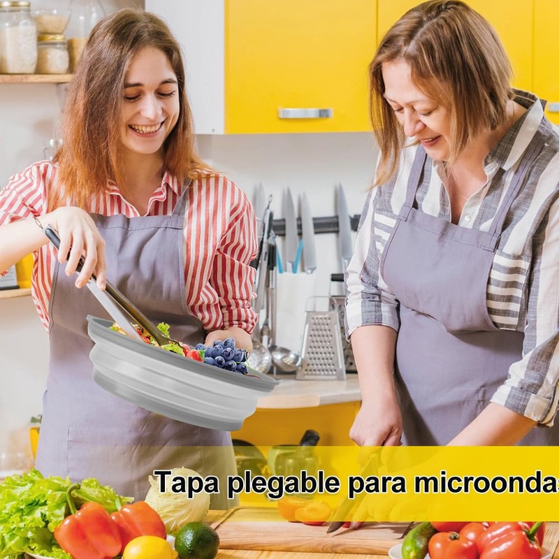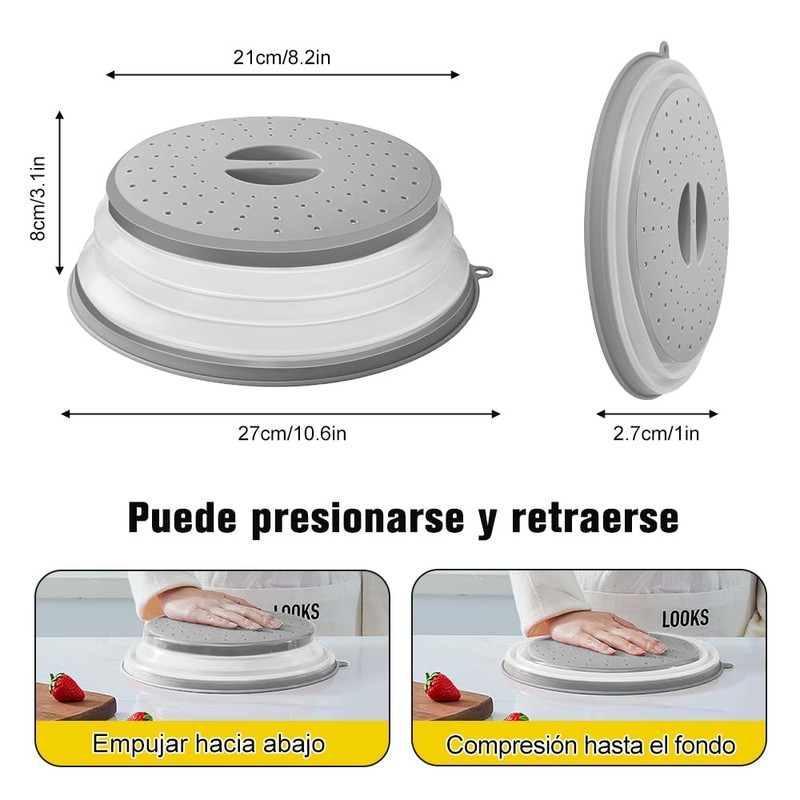 - ★【muy practico】:Diseño plegable, tapa apta para microondas que se adapta a la mayoría de platos, cuencos y tazas, tapa apta para microondas para cubrir alimentos cocinados y sobras, sino que también puede utilizarse como cesta para lavar verduras y frutas. Microwave cover plegable tenemos manijas de diseño en la parte superior de la tapa, fáciles de sostener y estirar. Se pliega para un fácil almacenamiento, presiona la tapa con el pulgar y luego aprieta para almacenar. Además, hay pequeños orificios para colgar en el borde, que se pueden colgar y almacenar sin ocupar espacio.
