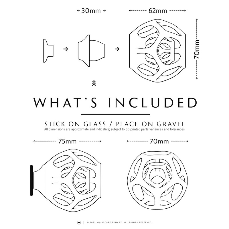 - Unique shrimp cave with suction cup (70D x 75H mm); decorative item just right for small tanks; place it on gravel or stick on glass